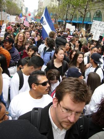 The rally on Saturday was part of the National Day of Solidarity, against Rep. Sensenbrenner’s recently passed H.R. 4437 and the Specter Senate markup of this bill. During the rally, organizer Evelyn Sanchez received calls from other activists gathered at other actions around the country. Though it had begun to rain in San Francisco, nothing could diffuse the joy at the announcement by Eun Sook Lee of the National Korean American Service & Education Consortium that there were a million people gathered at City Hall in Los Angeles. Other calls came in from actions in Boise, Idaho and Philadelphia, Pennsylvania. Shouts of “Si, se puede,” or “Yes, we can,” (the rallying cry of Cesar Chavez’s United Farm Workers during the grape boycotts of the 1960s and 70s) echoed at that rally and throughout the weekend, at every occasion.